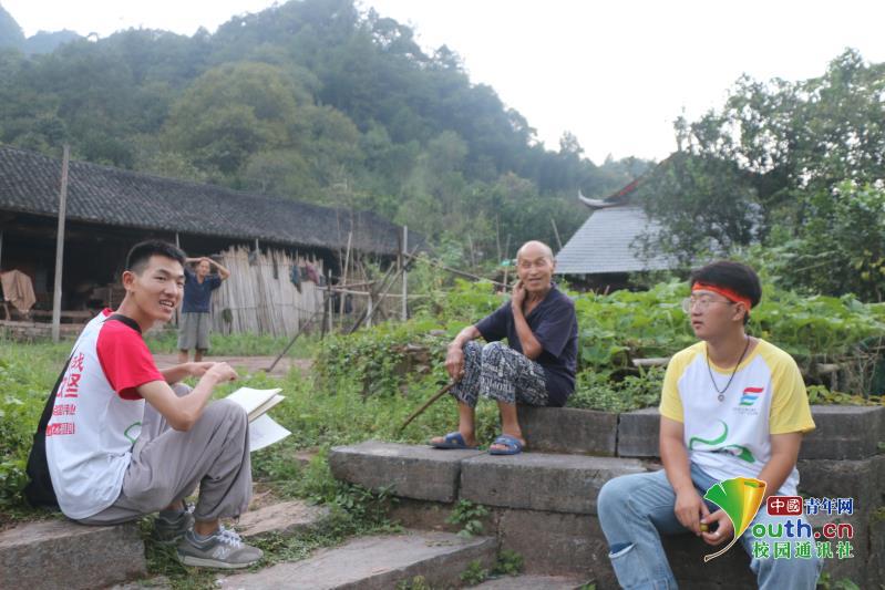 图为志愿者与村民了解吊脚楼的建造技艺。通过了解,吊脚楼的建造包含排扇、起扇、拜梁、开梁口、缠梁、上梁、翻梁木、赞梁木等程序。中国青年网通讯员 李景芬 摄