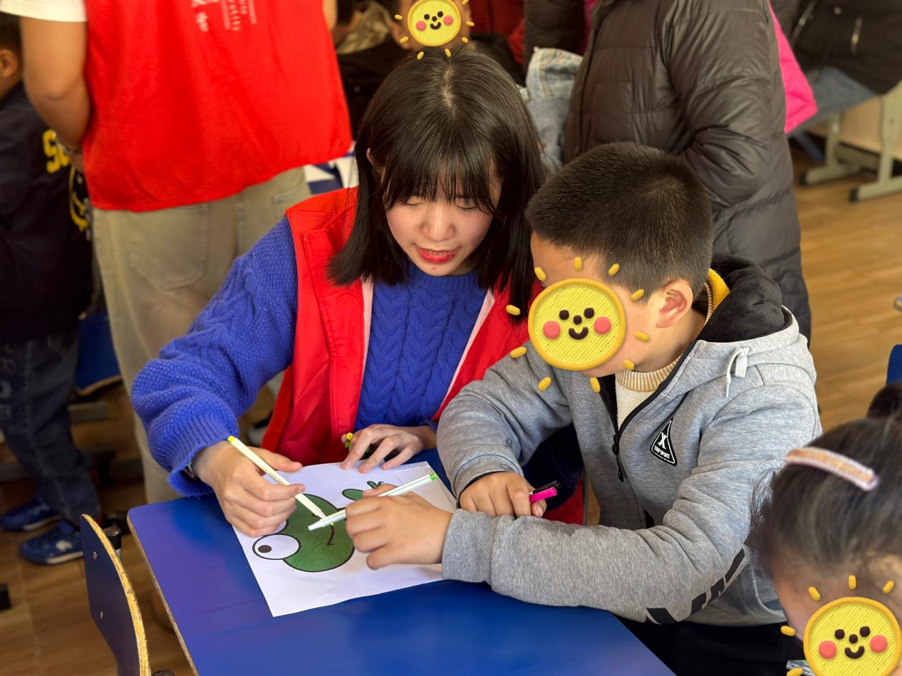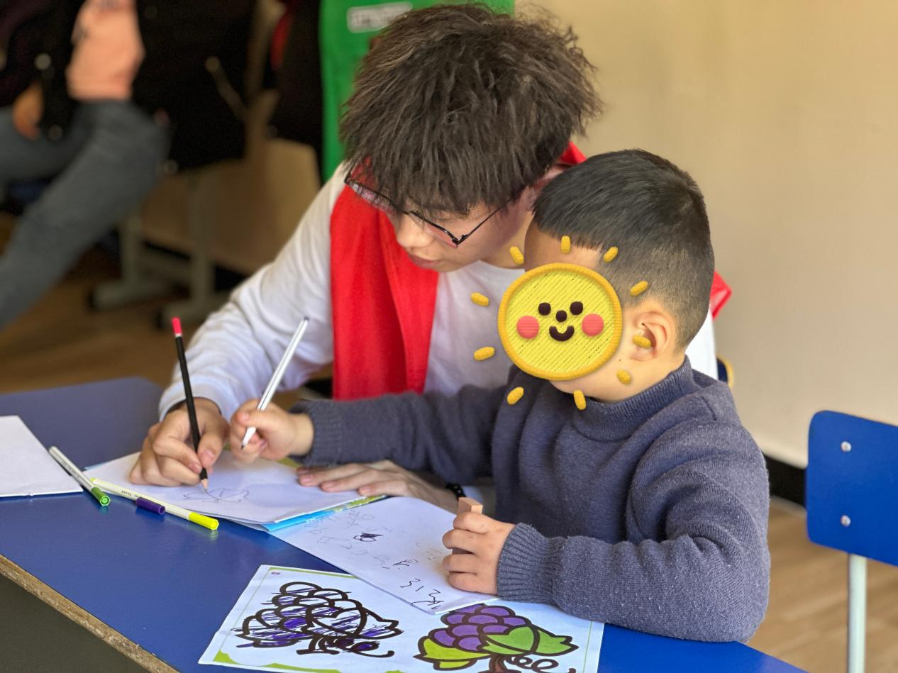 要对自闭症儿童群体进行美育启蒙,是一件充满意义但十分考验耐心与能力的事情,学生志愿者到达爱心林启智学校后,以两两结对的形式,通过教小朋友们如何辨别颜色、如何使用画笔、如何解构简单图案、如何临摹线条、如何组合图形的教育方式,一步一步慢慢的启发他们,在启发的过程中充分调动小朋友们对颜色、对绘画的兴趣。