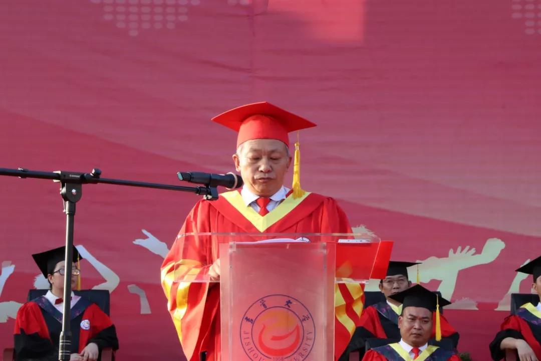 毕业典礼在雄壮的国歌声中拉开帷幕。首先,吉首大学党委书记、校长白晋湘教授致毕业典礼祝辞。教授发表了热情洋溢的讲话。他语重心长地向全体毕业生提出了几点殷切的希望:一是希望每位毕业生用平常心对待人生,一切从小事做起,先做自己能做的,再做自己想做的;二是希望每位毕业生学会适应环境、适应社会;三是希望每位毕业生认真规划自己的人生,要有自己的人生目标;四是希望每位毕业生要有信心。最后,他还希望同学们牢记以人名校、以业报国的校训,常回家看看,继续关心和支持母校的发展。