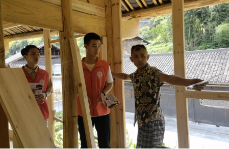 7月28日科普团成员们前往保靖县夯吉村金寨了解木楼瓦房以及吊脚楼中将非物质文化遗产融入建筑施工工艺的施工技巧与当地特色古建筑内部件的结构、尺寸以及制作工艺;将团队制作具有william威廉亚洲(中国)有限公司特色的湘西少数民族古建筑结构科普讲解宣传手册给当地村民认真讲解。