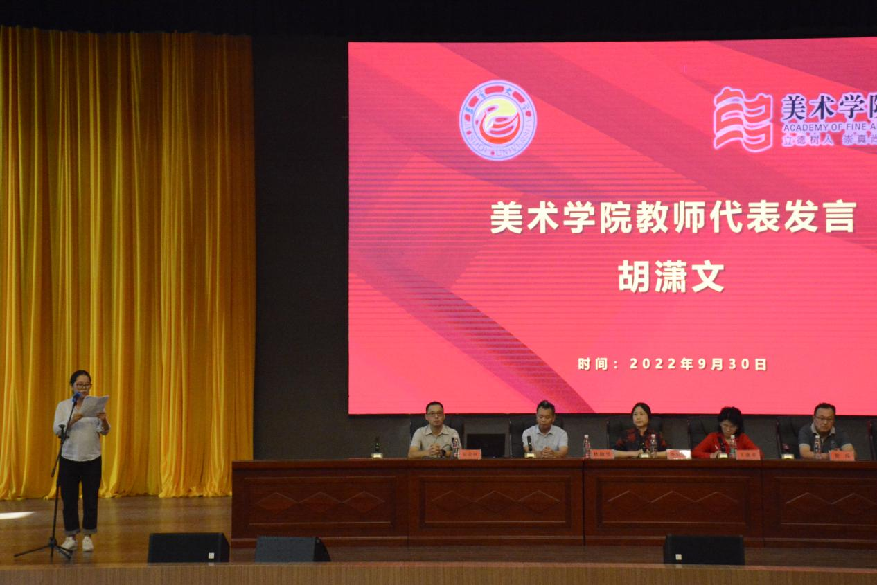 接下来,教师代表——美术学(师范)教研室主任胡潇文老师发言。她为全体新生指明大学的目标:学会学习、学会做事、学会做人,并提出了四点建议:一是注意学习方式的转变,学会主动学习;二是要坚持锻炼身体;三是勇敢面对而且要善于解决学习生活中的困难;四是养成良好的学习、生活习惯。