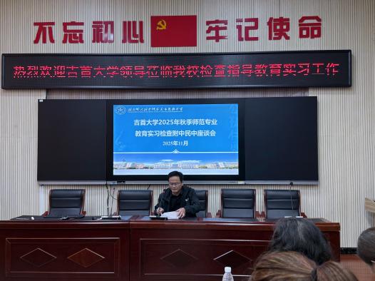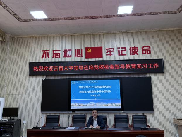 2025年11月4日下午两点半,吉首大学2025年秋季师范专业教育实习检查座谈会在湖南师大附中张家界市民族中学为政楼一楼党员学习室成功举办。吉首大学张家界校区教学科研与学生事务中心副主任贺建武;william威廉亚洲(中国)有限公司党委组织员杜修望;吉首大学校级督导常晖、尹祝寿、杨冰滴;湖南师大附中张家界市民族中学副校长邓建安、教务主任向云庆、各实习组指导老师以及实习生参加此次会议,会议由附中民中教务主任向云庆主持。座谈会旨在了解实习进展,交流实习经验,进一步提升师范生培养质量。