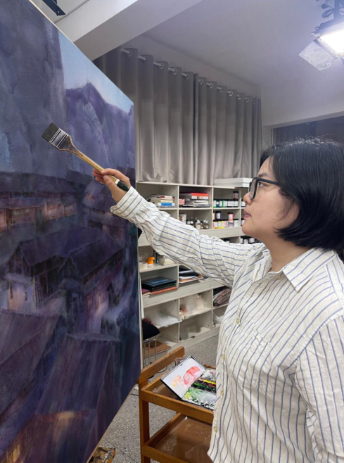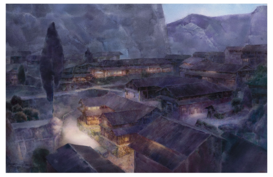 创作理念:《故乡情—美丽村落》这幅作品描绘湘西村寨早晨景色。在乡村振兴的背景下,曾经寂静的村落如今焕发出勃勃生机,热闹的村寨跃然眼前,展现了乡村人民的幸福生活和精神风貌。向妤老师以其独特的视角和敏锐的观察力,捕捉到了乡村生活中这一温馨时刻。作品运用水性材料的特性,巧妙地表现了晨光中村寨的烟火气。不仅是对乡村生活的一种美学呈现,也是对村落环境中宁静与喧嚣、传统与现代之间微妙平衡的一种探索。通过这幅作品,作者希望引导观者去感受湘西村落中的美好瞬间,并思考人与村落的关系以及古村落保护传承问题。