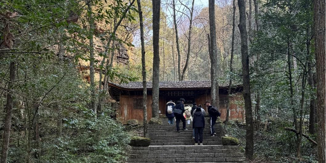 在规划建设部陪同下,唐琼副教授所带研究生团队徒步进入鹞子寨,并沿着蜿蜒的山路前行,穿过茂密的竹林、石板游道对景区的一些景观节点、存留建筑、绿化带以及自然景观进行了全面的考察。在考察过程中唐琼导师引导研究生从提升鹞子寨整体风貌、完善旅游配套设施、增强当地文化感染力和挖掘文旅价值的角度去观察和分析鹞子寨的设计方向。