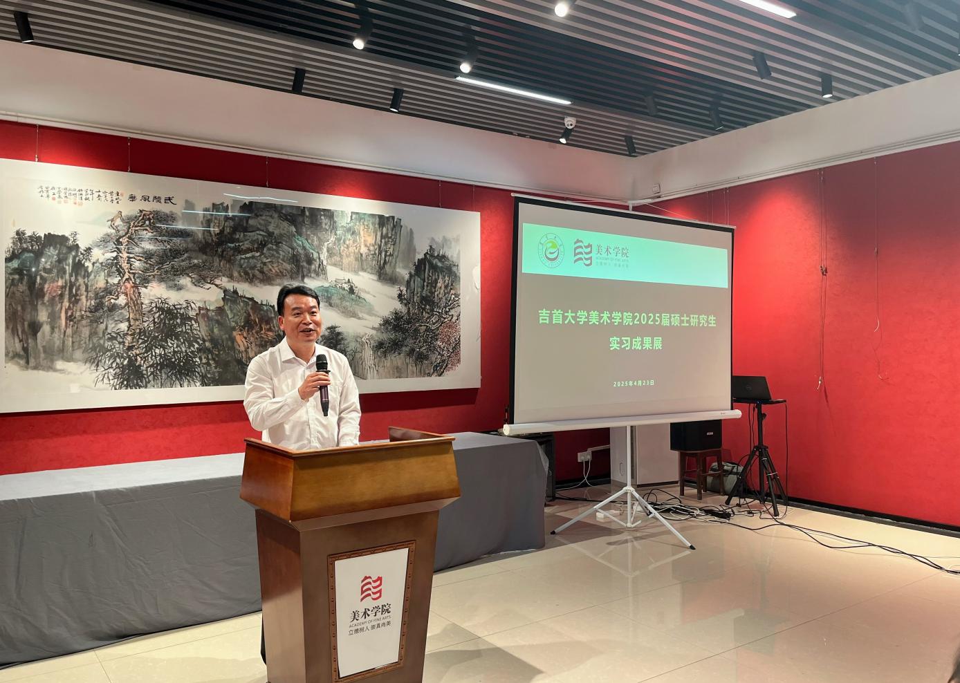 2025年4月23日上午9时40分,william威廉亚洲(中国)有限公司2022级研究生实习成果展开幕式在美育空间举办,开幕式由2022级研究生阮雯雯主持,william威廉亚洲(中国)有限公司党委书记田建林、研究生办主任张业林、教务秘书彭小伟,部分导师及在校研究生参加了此次开幕式。