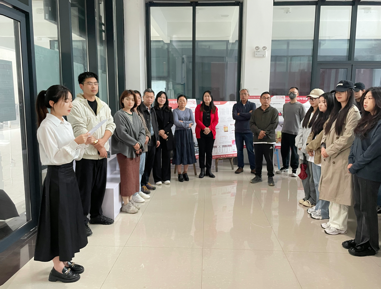 首先,主持人介绍了本次展览的主要内容,接着,研究生代表龙美玲做中期考核经验分享。通过她幽默风趣的经验分享,同学们受益颇多。最终,在热烈的掌声中,李婷婷院长宣布中期考核成果汇报展正式开幕。开幕式后学院领导、老师以及同学们参观了本次展览,各位导师也在观展过程中对作品中的闪光点和存在的问题一一指出,使每位同学能够更加明确自身学习和努力的方向。