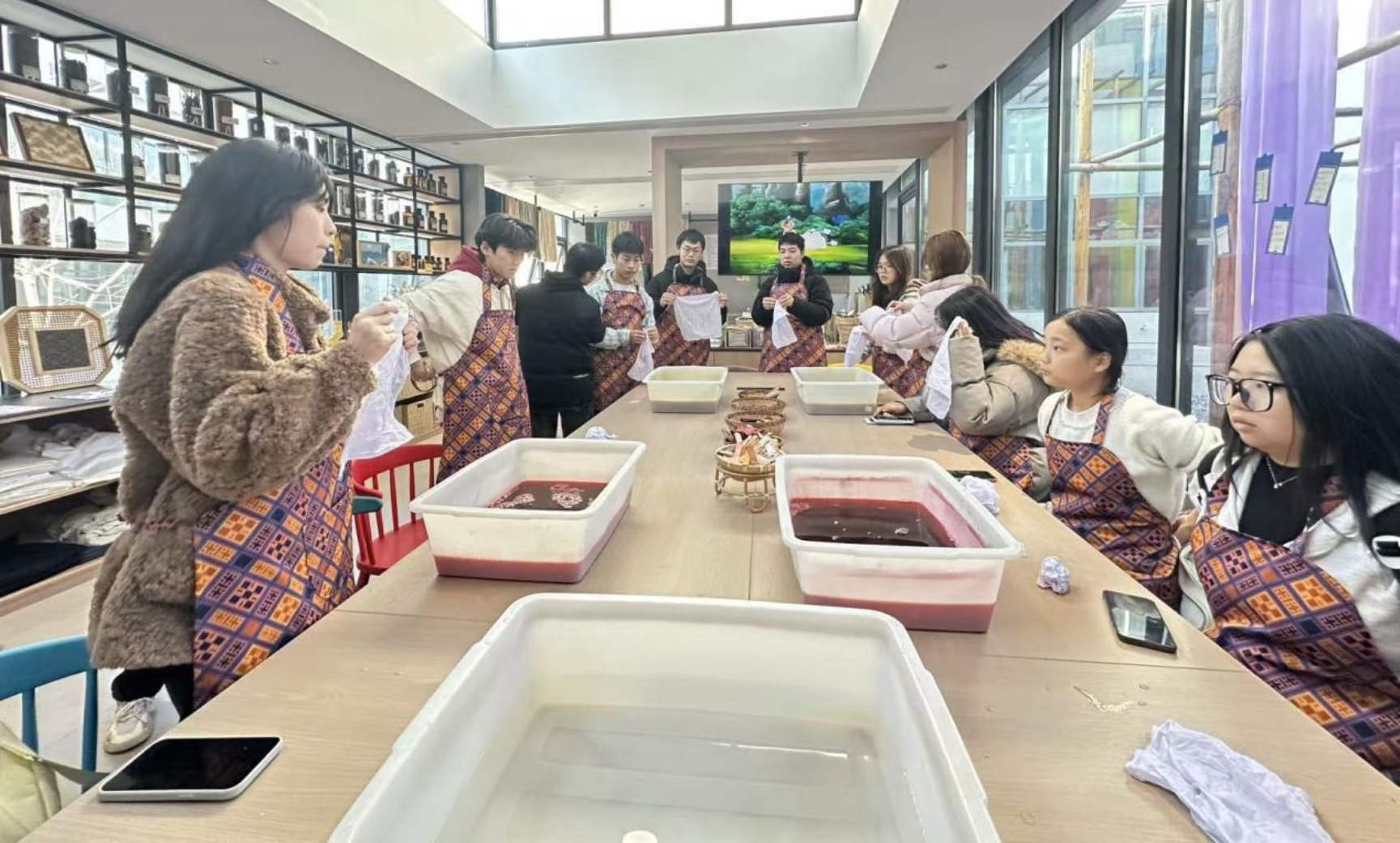 最后,学子们体验了植物扎染技艺,在传承人指导下,同学们充分发挥专业特长,构思设计、穿针引线、捆扎布料,再将布料浸入染缸。经过反复浸染、晾晒、拆线,原本素净的布料上浮现出灵动的蓝白纹路,独特的艺术效果让大家欣喜不已,收获了专属的扎染作品,感受了传统染色工艺的自然之美。