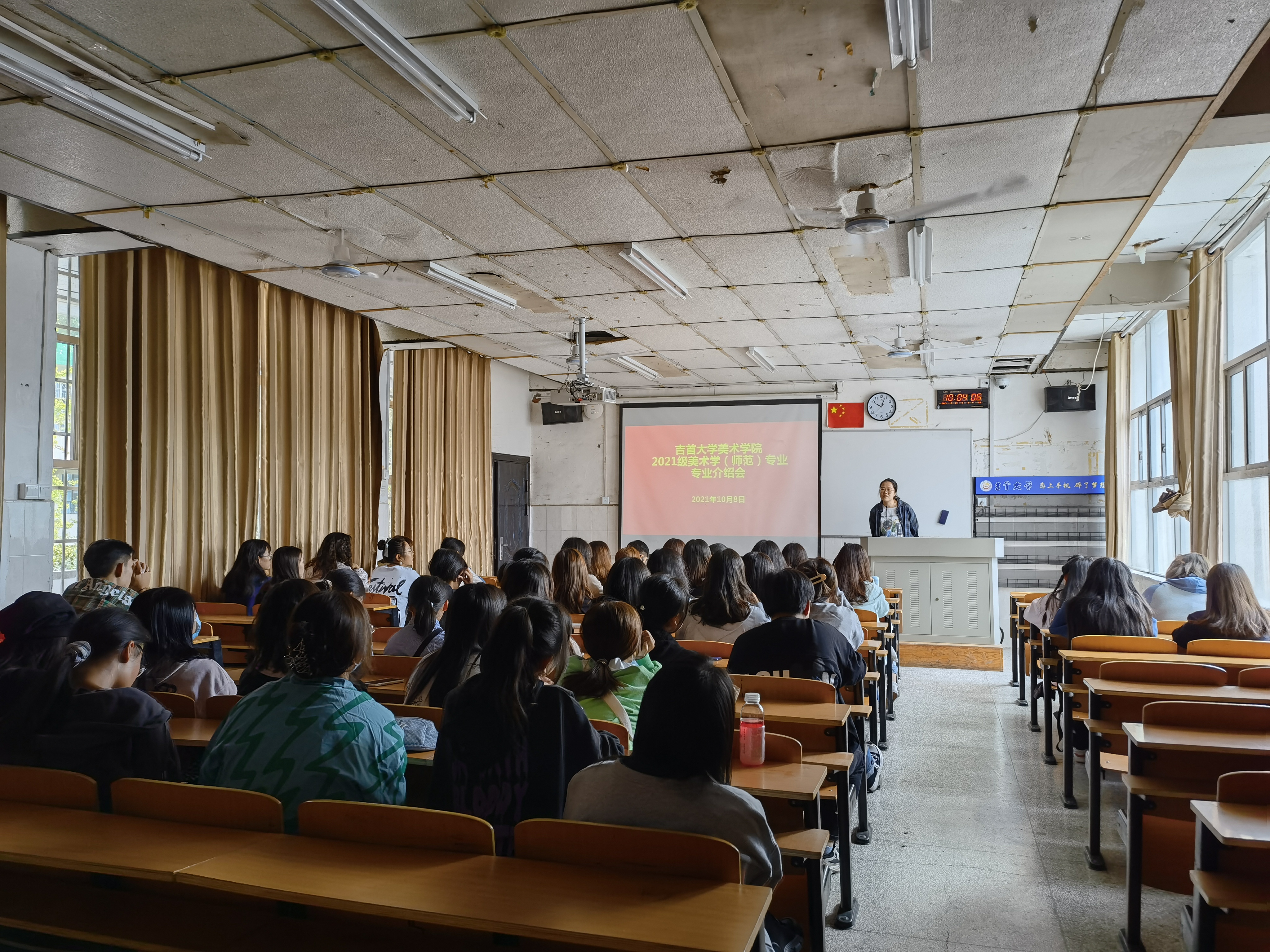 大会上,吴工老师首先以昂扬自信的话语将我院美术学专业的独特优势、美术学美育“化人”、“成人”的专业作用娓娓道来,将我院美术学专业因材施教、美术学专业育人育才成果,在2021级新生面前如水墨画般缓缓铺展开来,将整场专业大会烘托出具有美术学专特特色的美育氛围。